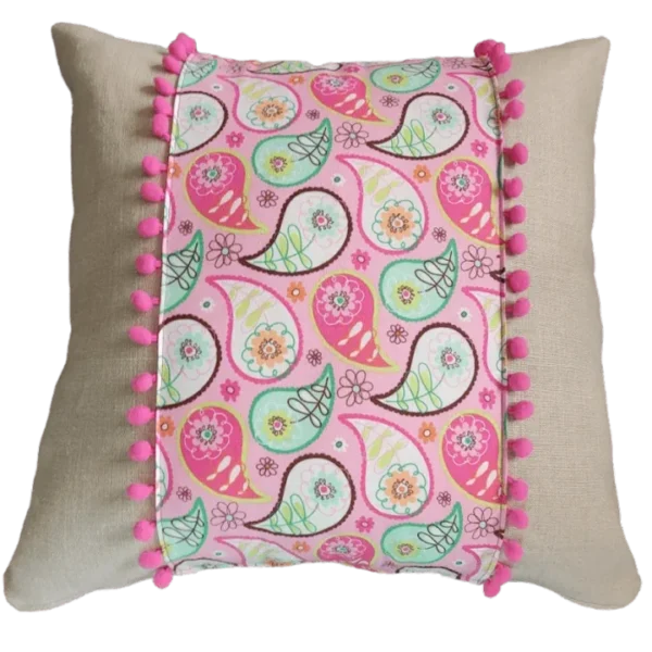 Pretty in pink with this Paisley inspired psychedelic swirled cushion. Complete with tiny pom-poms.