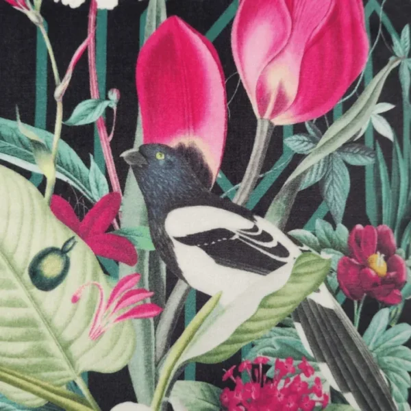 A sumptuous velvet cushion with a bold tropical print in beautiful green’s and pinks. Edges are featuring pink pom-poms. Reverse is plain black.